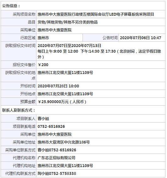惠州市中大惠亞醫院行政樓五樓國際會議廳LED電子屏幕系統采購項目招標公告