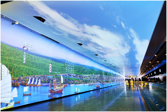 人在旅途,機場中轉站成為旅客掃去一身疲憊的落腳點。為了提升旅客飛行前后體驗,廣州白云國際機場著力于借助高科技手段激活機場空間,打造了一條集公共服務、藝術展示、廣告發布于一體的“時空隧道”,這在全國機場尚屬首創。在全長約200余米,空間面積超過2500平方米的時空長廊中,總共采用54臺NEC激光投影機,帶來一場奇譎夢幻的穿越之旅。