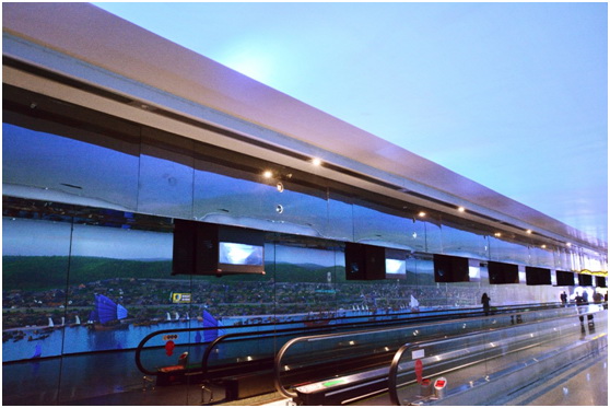 白云機場巧借航站樓主樓負一層通道空間,48臺NECPX753UL+激光投影機由于全部采用隱藏安裝的方式,能帶來很強烈的沉浸感及美觀度。而隧道因受行人穿過造成陰影的影響,有超過半數的投影機選擇搭配了超短焦反射式鏡頭。要知道,在如此大尺寸畫面上使用超短焦反射式解決方案,其實現投影融合的難度相當之高,但最終營造出的畫面感極強,從墻面延伸到天花板的融合畫面渾然天成,讓抵達廣州的旅客旅途勞累頓消殆盡。
