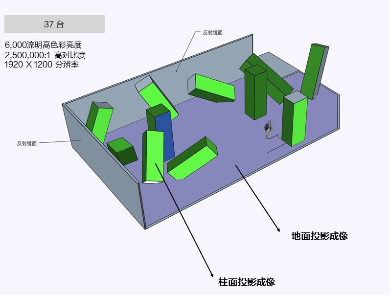 其中,在地幕投影中,增加反射鏡可以增加景深感,讓觀眾有更強(qiáng)烈的沉浸感;在柱面投影中,投影機(jī)采用豎投及ELPLX01超短焦鏡頭,即使觀眾的觀看距離很近,投影機(jī)光路也不被遮擋。另外,地面投影和柱面投影都添加了互動(dòng)裝置,可以捕捉到人的動(dòng)作,隨之做粒子變化。以科技賦能藝術(shù),打造無邊界視界體驗(yàn)。