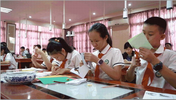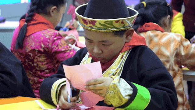 西藏和廣州兩地的學(xué)生們正在認(rèn)真制作蝴蝶剪紙
