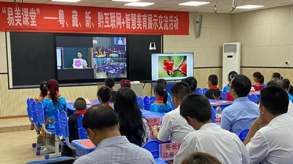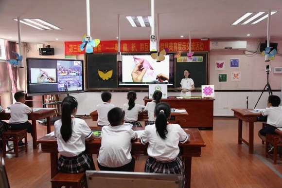 “同學(xué)們完成了剪紙蝴蝶的課堂任務(wù),請林芝一小的同學(xué)點(diǎn)評一下獨(dú)山六小同學(xué)的這份作品吧……”7月16日,在廣州市黃埔區(qū)怡園小學(xué),何青云老師正在對著屏幕,繪聲繪色地講課,臺下的學(xué)生也紛紛看向屏幕。原來,這是第三屆“易美課堂”活動,屏幕里,聽課端的西藏自治區(qū)林芝市第一小學(xué)、黔南州獨(dú)山縣第六小學(xué),與主講端的怡園小學(xué)的學(xué)生們一起,互相點(diǎn)評對方的蝴蝶剪紙作品……