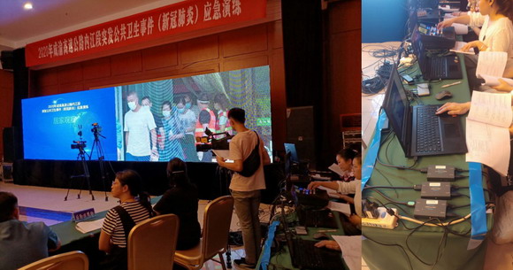 內江日報社根據項目采購了若干美樂威NDI編解碼器,并部署到應急演練網絡傳輸項目中。在應急指揮部,2臺美樂威Pro Convert NDI編碼器用于連接電腦PPT畫面及導播臺切換的攝像機畫面,1臺Pro Convert NDI解碼器連接室內的顯示屏,接收演練現場發送過來的視頻畫面;演練現場的部署略有不同,報社安裝了1臺Pro Convert NDI編碼器,用于連接導播臺切換的畫面,2臺NDI解碼器連接分別連接顯示屏,播放應急指揮部發送過來的PPT畫面和視頻畫面。以上6個編解碼器都連接到本地千兆交換機,通過點對點光纖專線進行互聯傳輸,F場的音頻信號也通過NDI協議傳輸,并通過HDMI音頻分離器在本地播放。這樣的方案搭建順利演繹了一場科學高效的衛生防疫處置行動,達到了預期效果。