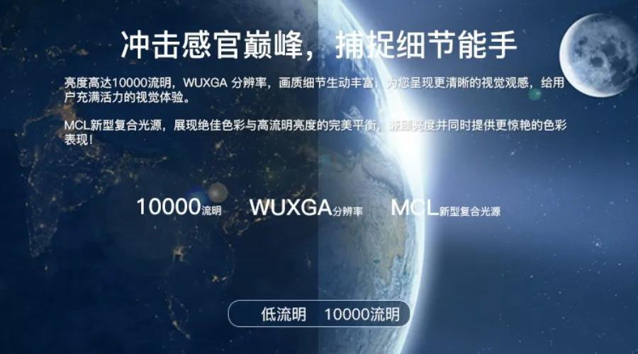 迪恒工程旗艦投影機DU10K,具備10000ANSL流明高亮度,白天也能投射出清晰畫面;搭配WUXGA分辨率,畫面細節更加生動豐富,為用戶呈現更清晰的視覺觀感;新型MCL復合式激光光源,完美兼顧亮度與色彩,提供長時間穩定的亮度輸出。