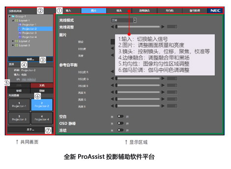 針對目前數字化智能環境,新品PA1004UL系列對軟件平臺進一步升級。全新的NEC ProAssist投影輔助軟件平臺,可以輕松實現多機控制、遠程管理、邊緣融合調校、圖像分區域均勻性調整、伽馬中間色調調整及攝像頭多機顏色校準等功能,這一軟件平臺對于大規模顯示設備的操控部署和需要進行集成項目中畫面校正的用戶來說,無疑是如虎添翼。