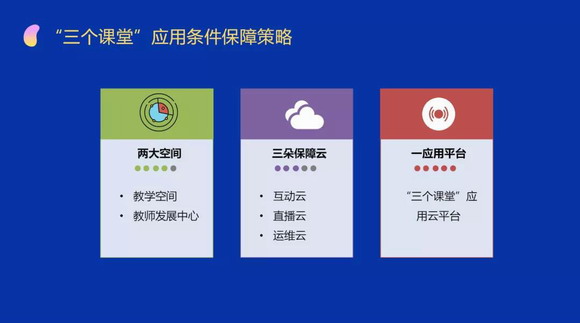 杜炫杰認為,目前“三個課堂”常態化應用面臨著互動、教研、統籌、運維、監管5大難點,各地需要夯實“三個課堂”建設基礎,優化“兩大空間、三朵保障云,一個應用平臺”的“三個課堂”應用條件,構建區域與校園二級應用架構,并通過詳實的案例,分析了區域教育局是如何形成“三個課堂”按需應用特色的。
