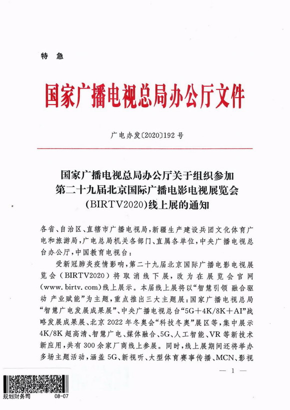 《國(guó)家廣播電視總局辦公廳關(guān)于組織參加第二十九屆北京國(guó)際廣播電影電視展覽會(huì)(BIRTV2020)線上展的通知》現(xiàn)已公開(kāi)發(fā)布: