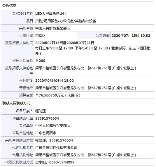 中國人民解放軍某部隊LED大屏幕采購項目公開招標公告