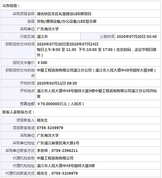 廣東海洋大學湖光校區(qū)東區(qū)禮堂建設LED屏項目公開招標公告