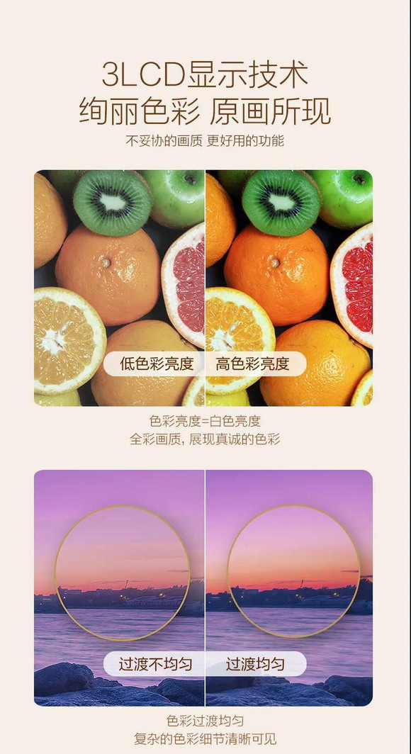 3LCD技術(shù)強大的精細的色階還原能力,讓投射出的圖像自然、柔和、平滑,能夠更大限度復(fù)刻電影中色彩的力量,展現(xiàn)畫面里的完整細節(jié),讓畫面呈現(xiàn)更精彩卓越,給你身臨其境的震撼觀影體驗。