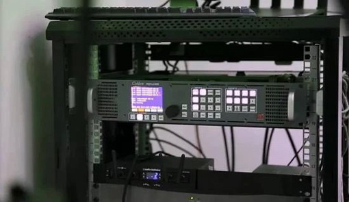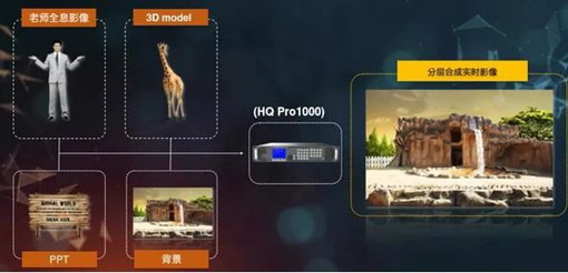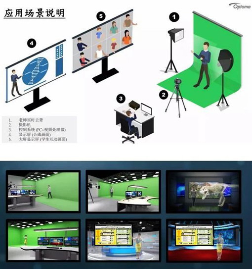 在使用這套系統時,教師一個人就能完成授課過程:教師在綠幕棚進行錄像,影像將會被傳輸到奧圖碼HQ Pro 1000影音處理器中,處理器會將課程需要的的背景畫面、PPT簡報、3D畫面甚至AR影像與教師講課的身影融合,呈現出更加的沉浸的教學效果,然后實時將畫面傳遞到學生的屏幕上。