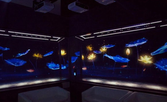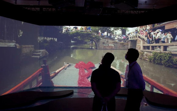 此展項(xiàng)在2019年北京國際攝影周上初次亮相,以“水鄉(xiāng)遇到水城”為主題,用沉浸折幕投影展出優(yōu)秀攝影作品,科技遇上藝術(shù),碰撞出美麗的創(chuàng)意花火。由三臺(tái)攝影機(jī)同時(shí)拍攝的影像,經(jīng)由多通道邊緣融合,在三折幕上重新融合成一個(gè)完整的畫面,真實(shí)地還原了拍攝時(shí)的人眼視角。未到水鄉(xiāng),已身在水鄉(xiāng)。