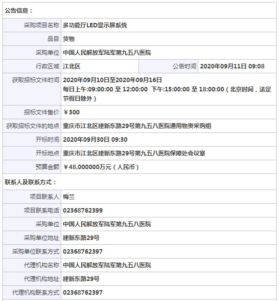 開標(biāo)地點(diǎn): 重慶市江北區(qū)建新東路29號第九五八醫(yī)院保障處會議室