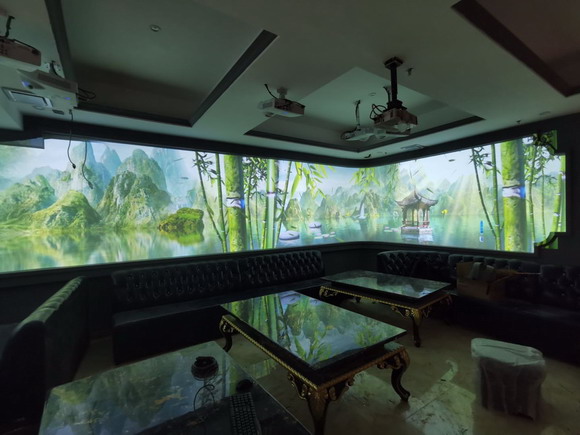 這家沉浸式KTV可以根據客人的需求塑造生日派對、求婚表白、團隊聚餐等不同的主題風格。NEC CK4155W短焦液晶投影機擁有3500流明亮度,能夠在包廂內實現高亮度大畫面投影。同時,多通道融合投影解決方案打造的大畫面賦予包廂四面墻體魔力一般,璀璨星空、靜謐叢林、浪漫花海等場景切換自如。