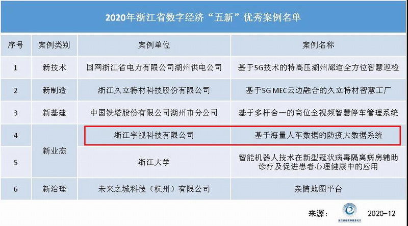 12月24日,浙江省信息化發展中心發布2020省數字經濟“五新”(新技術、新制造、新基建、新業態、新治理)優秀案例評選結果,宇視科技(uniview)基于海量人車數據的防疫大數據系統,集視圖研判、視頻預警、在線感知、數據運營等為一體,高效防控的同時注重保護隱私,被評為“新業態”優秀案例。作為數字經濟引領高質量發展的浙江方案、浙江樣本進行宣傳、推介。