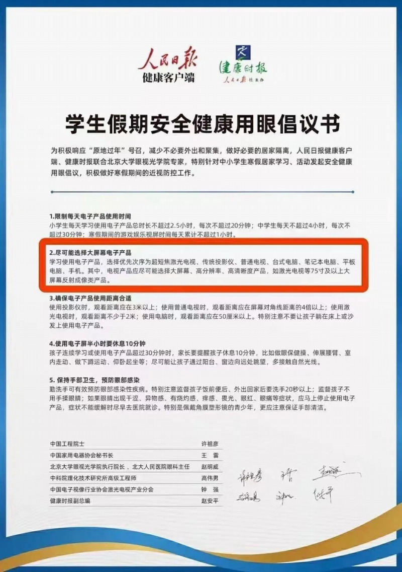 會上,針對假期學生用眼需求,與會專家發起倡議書:需要使用電子產品時,選擇優先次序依次為超短焦激光電視、傳統投影儀、普通電視、臺式電腦、筆記本電腦、平板電腦、手機。其中,電視產品應盡可能選擇大屏幕、高分辨率、高清晰度電子產品,如激光電視等75吋及以上大屏幕反射成像類產品。
