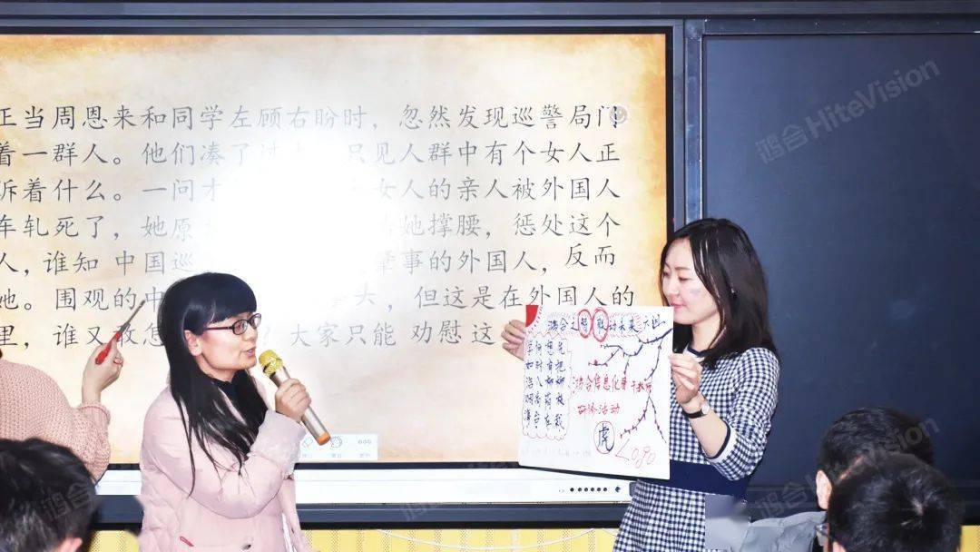 培訓中,鴻合高級講師針對信息化教學設備及教學軟件為老師們進行了詳細的講解和演示,重點圍繞鴻合白板、愛學班班、課堂評價等軟件工具豐富課堂形式,提高教學效率,活躍課堂氛圍等優勢,呈現了精彩紛呈的教學情景,使現場老師對鴻合的軟硬件產品產生了濃厚的使用興趣。每部分講授完畢后,老師們紛紛利用剛學到的蒙層、克隆、課堂活動等功能,對自己的課件進行修改提升,同時小組內部推選出一份優秀課例進行全班展示。