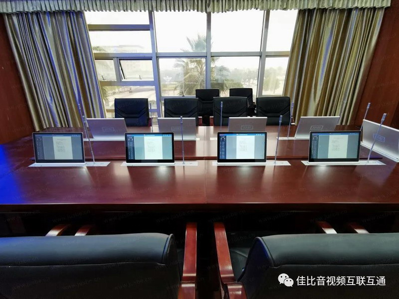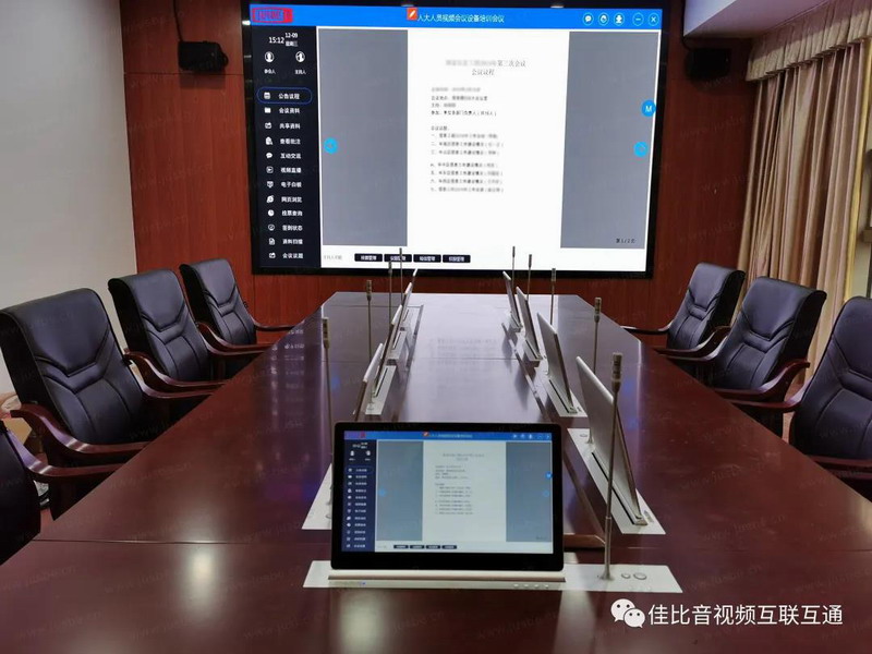 根據(jù)會議室布局,會議桌面安裝的無紙化一體升降端,采用1080P高清屏,屏幕觸控靈敏,書寫不晃。系統(tǒng)擁有豐富的會議功能,具備會議議程、簽到表決、文件上傳、資料閱讀、批注、同屏投影、白板互動、視頻播放、文檔加密、權(quán)限下載等,參會者只需手指觸控即可完成操作,整個(gè)會議過程高效又便捷。