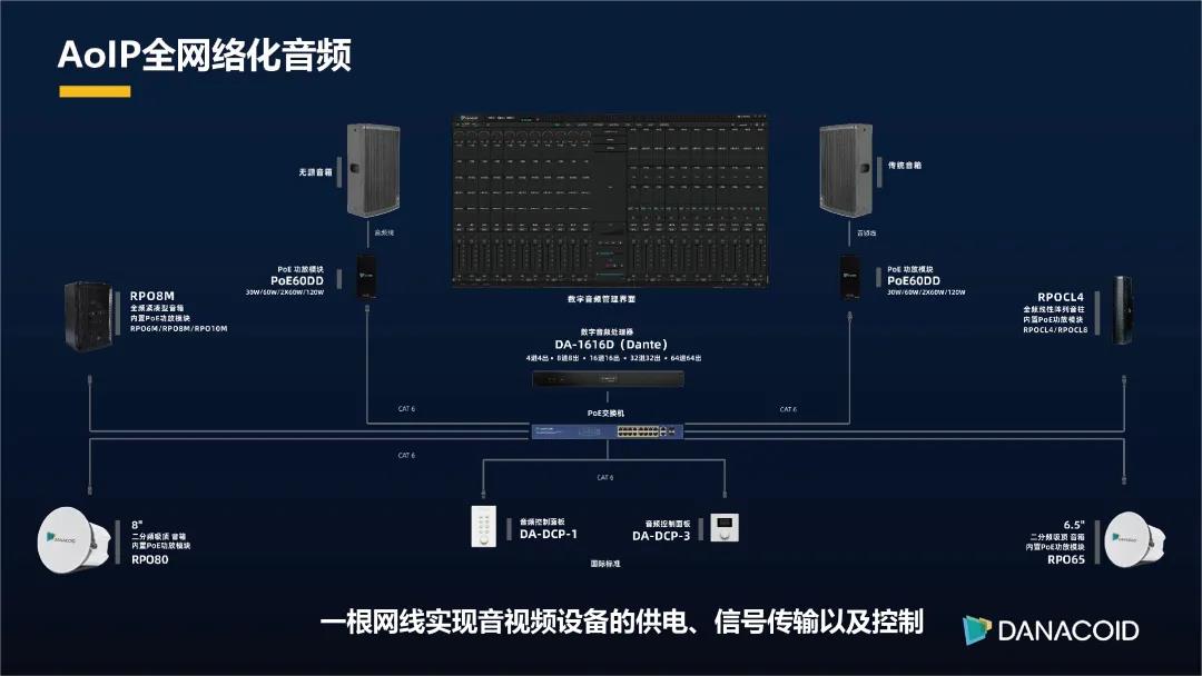 DynePro系統產品采用Dante數字音頻傳輸協議,結合自主研發的數字音頻處理器為核心向周邊拓展,將傳統的麥 克風、接口機、音箱轉變成在Dante傳輸的產品,從而實現整個系統AoIP的布局。