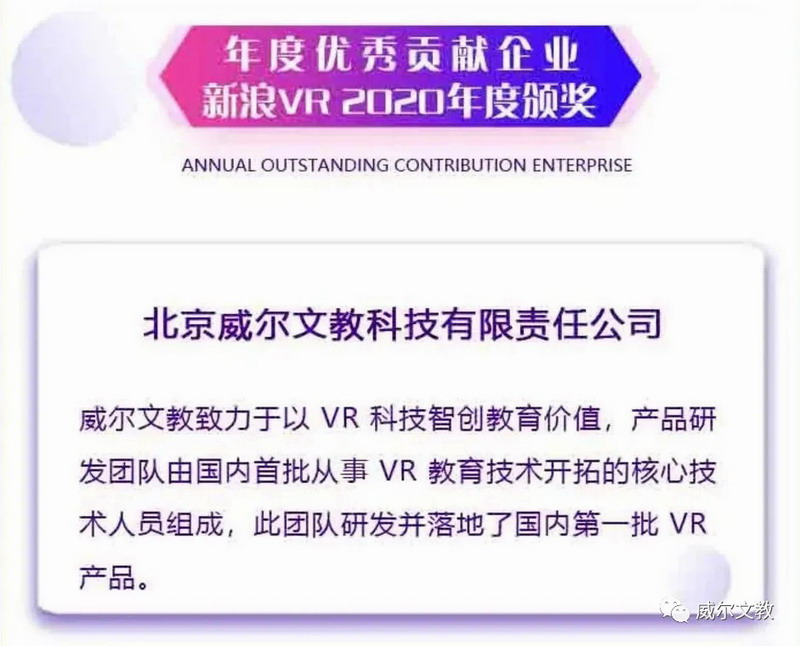 時(shí)至年關(guān),威爾文教一舉斬獲“新浪VR 2020年度優(yōu)秀貢獻(xiàn)企業(yè)”、“新浪VR 2020年度優(yōu)秀5G XR創(chuàng)新案例”兩項(xiàng)殊榮。為2020年提交了令人滿意的答卷。