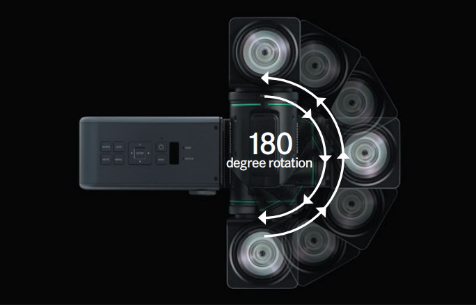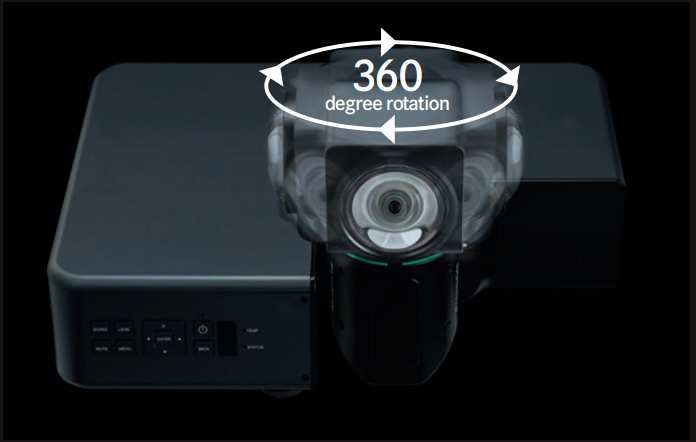 全球首款搭載“折曲型雙軸旋轉機構鏡頭”的激光投影機,只需旋轉鏡頭而無需移動主體,即可實現全方位投影,是一款具有劃時代意義的產品。可應用于過去無法投影的方位,呈現極具表現力的大畫面圖像,擴大了展館、數字標牌、美術館、博物館空間展示的可能性。設計小巧靈活,鏡頭收起后與投影機機體完美融合,可方便地收納。外觀時尚,追求了精致的設計。