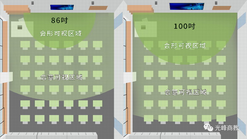 普通K12教室中,86吋顯示面積只能滿足三分之二的學生看清,100吋顯示面積可以滿足教室全部學生看清。顯示面積越大,更能滿足更大教室里的全部學生看清投影內容。