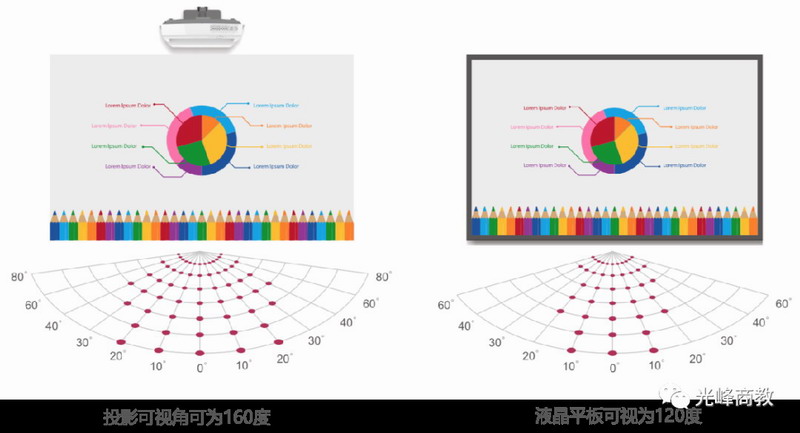 投影可視角更大,能讓教室側面及兩邊的學生都能看清畫面,促進教育公平性。