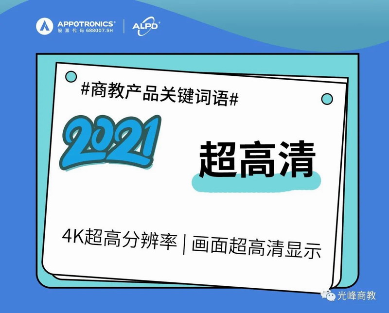 投影機的分辨率影響著投射畫面的質量,投射尺寸一定時,分辨率越高,畫面的展示效果越好。2021商教產品關鍵詞“超高清”,4K分辨率,擁有長焦和超短焦系列,更大畫面顯示的同時,顯示效果細節不丟失,畫質銳利清晰可見。