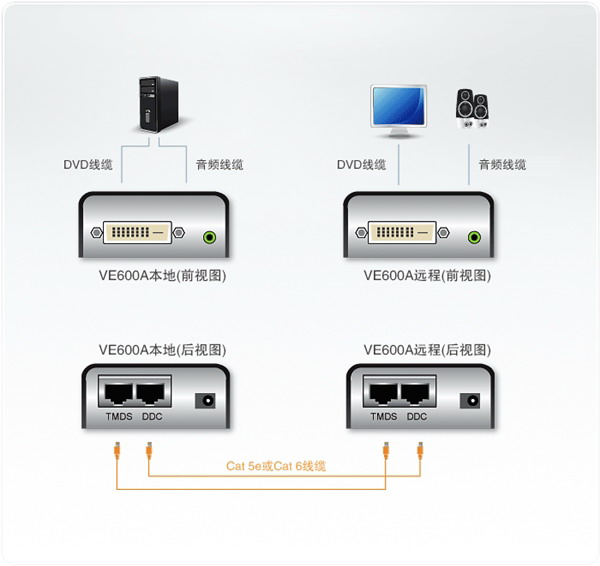 VE600A為一款具備音頻功能的DVI信號延長器,其可通過Cat 5e連接線延伸DVI顯示器與DVI信號來源設備達60m遠。使用Cat 5e線纜可提供簡單且可靠的連接,相當適合用于現在的大樓布局環境。VE600A更采用ATEN技術,僅需一條Cat 5e線纜即可傳輸影像與音頻信號;若需傳送顯示器EDID信號,則需使用第二條Cat 5e線纜。通過立體聲音頻傳輸以及寬屏幕格式的支持,VE600A提供了遠程設備清晰的影像與聲音質量。