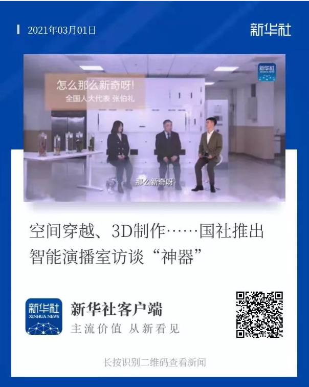 2021年全國“兩會”前夕,北京新華社新立方智能化演播室與天津中醫藥大學實驗室展開了一場別開生面的“異地同屏”訪談。此次異地訪談的視覺呈現,讓眾人驚呼真實,如同在同一空間進行交流互動。這也是新華社繼去年的“全息異地同屏”后,再次探索將數字化“黑科技”運用到兩會訪談中。