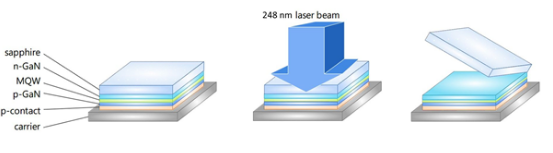 LLO和轉移之間的另一個區別是:后者涉及到粘合劑的燒蝕,所需激光通量比III-V族半導體低 5~20倍。這種高效率意味著較小的激光功率即可實現高產量。