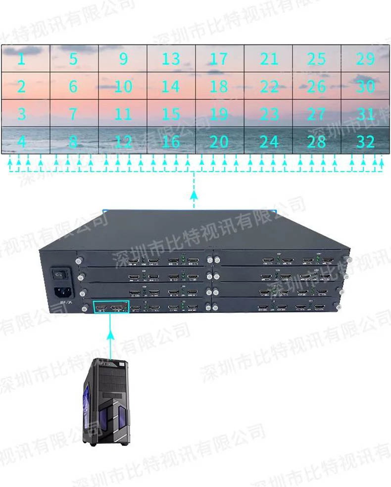 2.最大支持1進32出,可任意組合多種拼接模式:橫屏/豎屏/橫屏異形拼接,且支持大規模并聯使用。