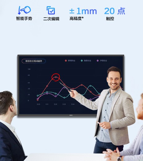 飛利浦會議白板65BDL2051T 使會議變得高效快捷,每個人在任何場景下都能輕松的參與會議,并且進行相互的溝通和協作。參會人員通過高精度多點觸控的紅外技術,即可實現流暢書寫,手背擦除,實時放大縮小和增刪頁面等操作,并可隨意對內容進行圈選、涂抹、記錄、批注,對比等操作。
