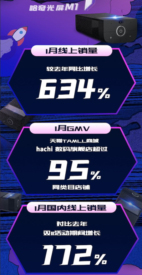 進入2021年,hachi哈奇光屏銷量迎來全面爆發。根據hachi哈奇光屏官方數據顯示,2021年首月銷量飄紅,總銷量已超過雙11全月,較去年同比增長634%。此外,由于線上消費火熱,hachi哈奇光屏線上銷量也在大幅增長,相比去年雙11銷售增長率達到172%。作為一個技術超前的智能投影產品,hachi哈奇光屏正受到越來越多家庭用戶的追捧。