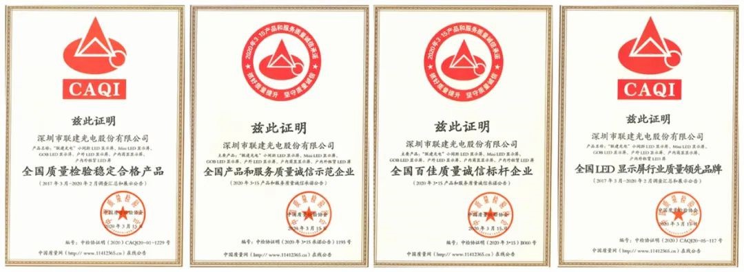 這也是聯建光電繼2017-2020年度連續四年斬獲“全國LED顯示屏行業質量領先品牌”、“全國百佳質量誠信標桿企業”、“全國產品和服務質量誠信示范企業”、“全國質量檢驗穩定合格產品”等行業榮譽后,第五次獲得行業權威機構認可。