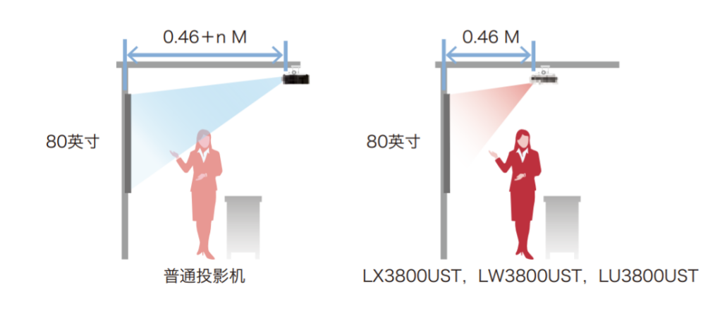會議進行中,非超短焦的投影機為了達到較好的投影尺寸,往往需要安裝距離屏幕較遠處。為了避免遮擋,主講者時常需要不斷調(diào)整走位。配置有超短焦鏡頭的PJ LW3800UST、PJ LU3800UST,投射 80 英寸畫面僅需約 46cm,即使是在較為狹小的會議空間也能輕松地應對。更短的安裝投影距離,不僅能有效規(guī)避遮擋,還能顯著的提升投影的亮度。