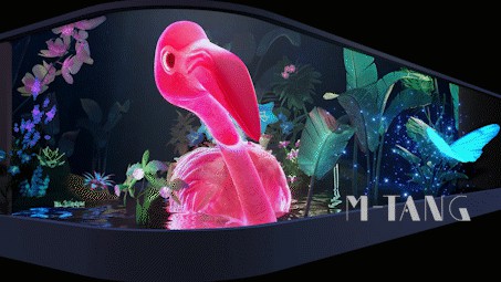 由利亞德(成都)文旅科技、利亞德·藍碩科技攜手M-TANG出品的裸眼3D公共媒體藝術位于成都府河與南河交匯處——合江亭。不同于成都太古里大屏的商業屬性,合江亭裸眼3D屏處于市政公園之中,是一個純粹的公共藝術媒體裝置。項目圍繞象征愛情的火烈鳥展開創意,營造了一個火烈鳥的自然棲息地,一個奇妙的立體景觀:異于尋常的大型火烈鳥被屏幕外飛舞的蝴蝶吸引,沖出屏幕的結界將蝴蝶帶入花園。