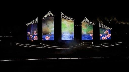 利亞德·勵豐文化利用湖心島、湖面、綠化等空間維度,結合LED藝術裝置船,演繹“春湖盛會”水舞聲光秀,圍繞“知識執光•百花筑夢”、“金鼠閏年•花舞迎春”兩個主題、六個篇章,展示中心知識城的發展歷程,結合春節、迎春花卉等元素,全方位打造一場文化視覺盛宴。