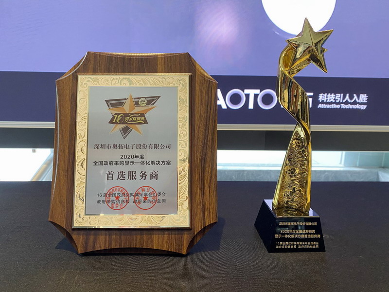 在3月18日舉辦的“16屆全國政府采購集采年會暨政府采購18周年雙慶典”中,奧拓電子被評為“2020年度全國政府采購顯示一體化解決方案首選服務商”,這證明奧拓電子LED顯示一體化解決方案深受行政事務機關用戶和代表的深度認可,彰顯了奧拓在品牌價值、產品質量和服務能力等方面的實力。