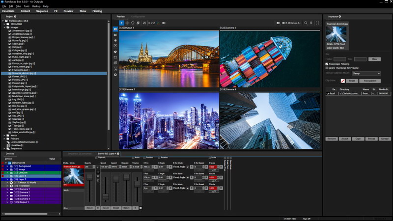 8 個物理 DisplayPort 輸出接口和 10 位色深的 4x4K60 非壓縮格式。系統靈活,通過可選輸入顯卡、特效和時間軸編程實現。用戶也可通過潘多拉魔盒窗口部件設計器進行實時遠程控制。