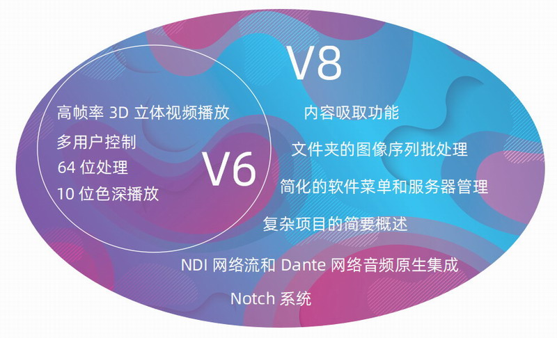 您渴望從 V6 中獲取的所有功能均保留在 V8 中,如高幀率 3D 立體視頻播放、多用戶控制、64 位處理和 10 位色深播放等。潘多拉魔盒 V8 新增內容吸取,多文件夾的圖像序列批處理,適合需要處理大量內容的演出或展示。