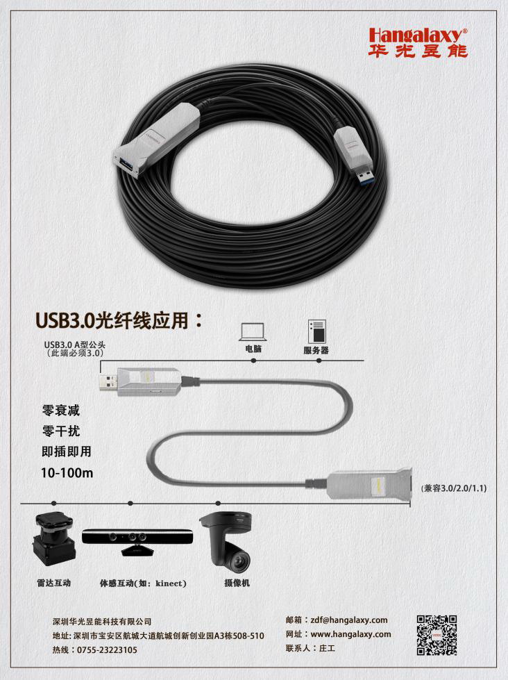 華光昱能Hangalaxy品牌USB3.0光纖傳輸線有HU3H(供電)系列和HU3(不供電)系列兩款產(chǎn)品,最高傳輸速率為5Gbps。