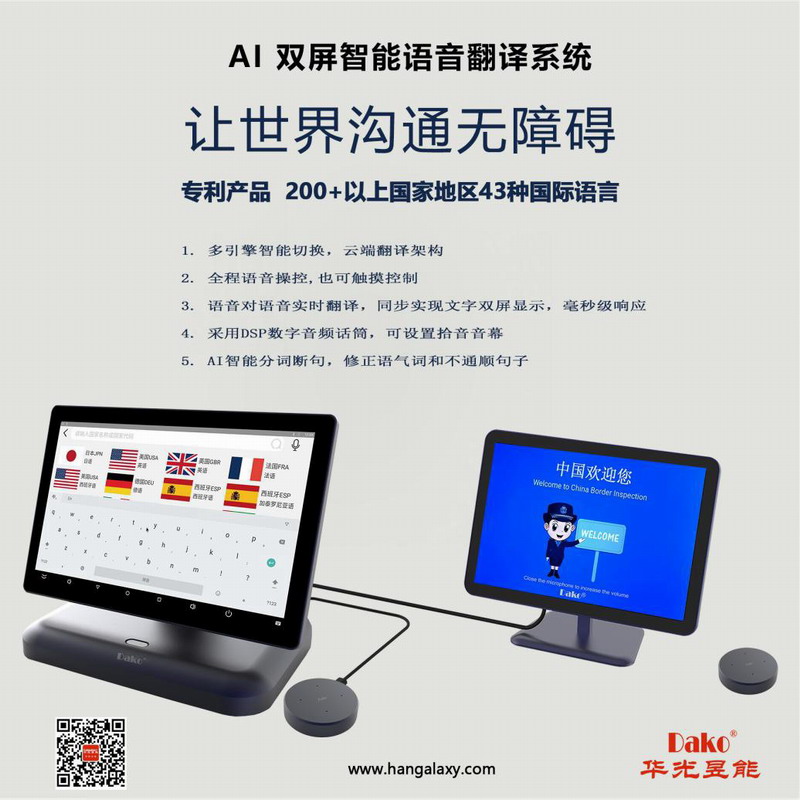 深圳華光昱能科技有限公司Dako品牌專(zhuān)利產(chǎn)品的AI智能語(yǔ)音翻譯機(jī),是一款基于云端的多引擎、多語(yǔ)種、多通訊信號(hào)接口的專(zhuān)業(yè)商務(wù)翻譯機(jī),專(zhuān)供涉外單位辦公使用。