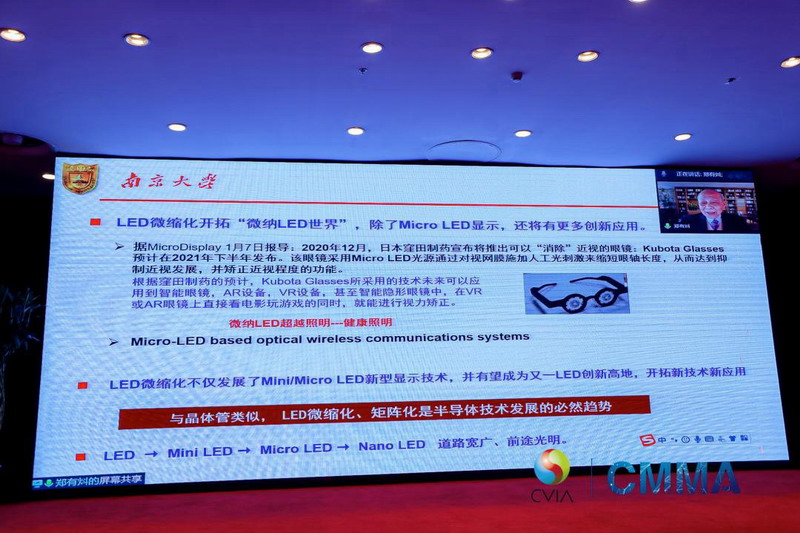 CMMA分會首席科學(xué)家/中國科學(xué)院院士/南京大學(xué)電子科學(xué)與工程學(xué)院教授鄭有炓通過現(xiàn)場連線發(fā)表了主題演講。他在開場先祝賀中國電子視像行業(yè)協(xié)會成立Mini/Micro LED顯示產(chǎn)業(yè)分會,并表示深信,這個分會的成立必將推動我國Mini/Micro LED技術(shù)和產(chǎn)業(yè)的發(fā)展,為我國信息技術(shù)產(chǎn)業(yè)高質(zhì)量發(fā)展做出貢獻。