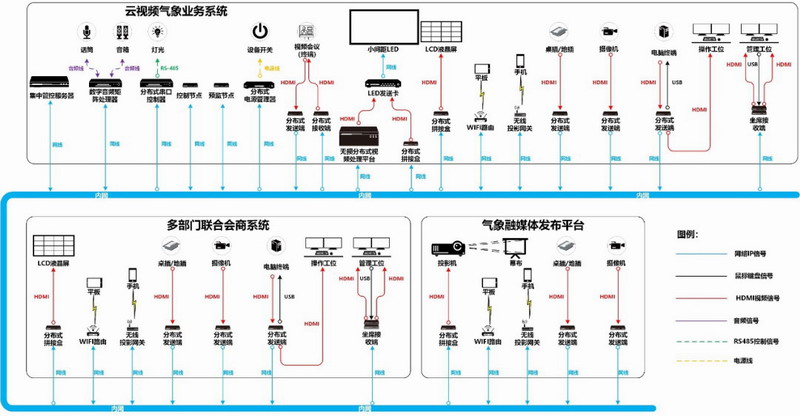 通過網絡化編解碼及高清晰度畫面傳輸,可基于無線網絡、地面氣象IP專網、專用通信衛星等進行災害信息共享平臺搭建,有效解決各防災救災部門信息孤島問題,通過與視頻會議系統、氣象預案系統等多業務平臺融合聯動,在第一時間實現氣象預警,提高整體的預警效率。