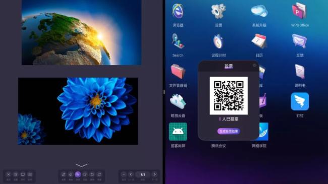 投票器是我們常見的功能,會議平板的投票功能設置相關選項后就可以掃碼投票,但是在實際操作過程中,視覺圖片需要同步對比選擇,借助應用分屏,可以實現一屏兩用,一半放置內容圖示,一半放置投票器,同步對比選擇更加清晰明確。