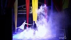 鮮艷的可透的大綢布從高空懸掛落下,演員穿梭于布匹,表演雙人舞雜技,通過舞姿表達戰爭年代的愛情純粹、真摯、熱烈。燈光巧妙的打在布匹上,雪花與霧森暈染出一片清新、自然的意境,一段浪漫、唯美的愛情,掩映在煙與光重疊的畫面中。
