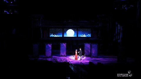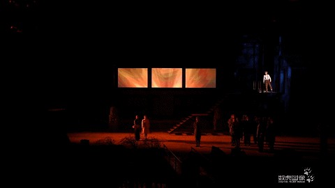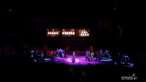 舞臺呈現三個表演空間,阿慶嫂和眾人定計如何智斗胡司令,前區一片熱鬧的婚禮場景,后區(二樓投影)舞蹈演員用肢體演繹定計的內容。可移動雙面鼓、屏風,樓梯等道具,不僅迅速有效的調度演員,還增強了舞臺張力。