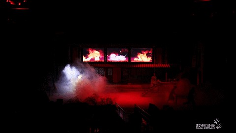 一場激戰在橫涇劇場上演,煙霧在舞臺上升騰,戰火在二樓屏幕上閃現。機械轉臺,抗戰道具、蹦床,再加上如電影般的特效,為現場觀眾奉獻了一場激烈的戰役。