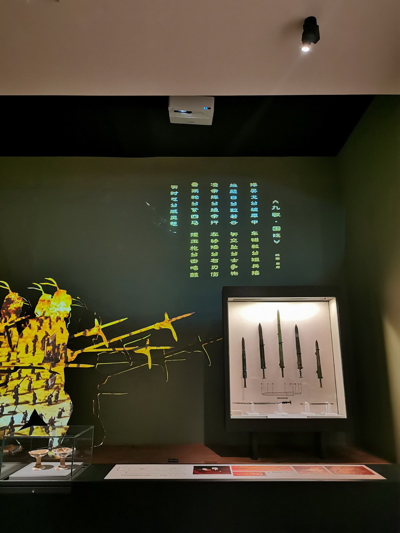 在三樓歷史文物展序廳,由1臺NEC PX803UL-BK+采用異形雕塑投影的方式,在火焰雕塑上勾勒出株洲的前世今生。NEC獨有的GCT幾何校正功能提供了強大的技術支持,通過對投射圖像快速、精細地調整,確保畫面內容和火焰雕塑完美契合,給觀眾帶來震撼的視覺沖擊。進入南楚要塞展區,由2臺NEC投影機復原的楚國軍卒合葬墓場景分外引人注目,七把青銅劍的背后隱藏著發生在2000多年前的戍邊之戰。其中1臺NEC激光投影機PA803UL+(8000流明、WUXGA分辨率)采用實物光雕投影的方式,通過清晰明亮的畫面再現2000多年前楚國軍卒手持吳戈征戰、護衛邊疆的戰爭情景。而另1臺NEC HLD反射式超短焦投影機 CU4200WD(4200流明、WXGA分辨率)則通過短距離投影,將偉大詩人屈原的《九歌·國殤》帶到觀眾眼前,讓今天的我們再次為楚國將士的那份英雄氣概和愛國情操所震撼。